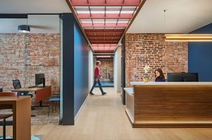 The new space highlights the building’s history while incorporating colorful, contemporary materials that reflect CMF’s brand and values. Layers of drywall were removed to reveal and celebrate the building’s original brick walls, which now frame the refreshed interior.