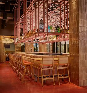 Sunda New Asian is not subtle about its influences. An eye-grabbing art installation evocative of Japanese cherry blossoms fluttering in the breeze is suspended over a pink quartzite bar, with another nearby made from pearlescent capiz shells from the Philippines. Framed photos from throughout Asia adorn another wall, mementos of the travels of founder and CEO Billy Dec.