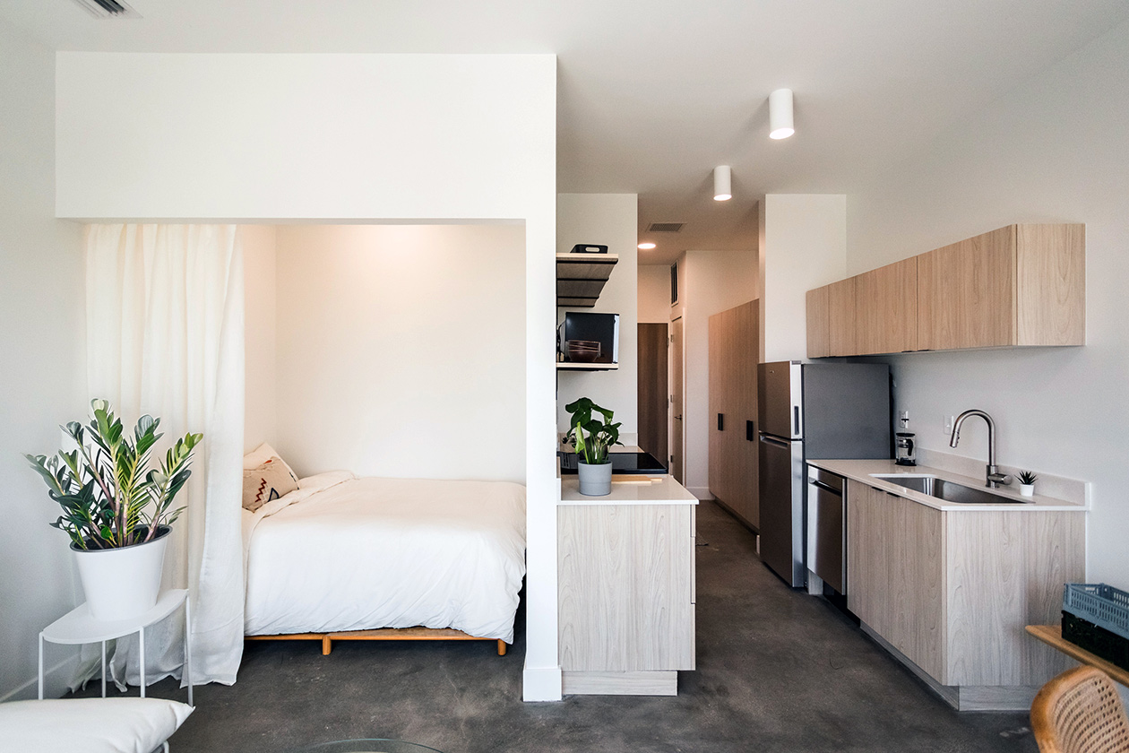 The interior emphasizes affordability and functionality, with small units—33 studios of 370 sq ft and 24 one-bedrooms of 550 sq ft—targeted at lower-income tenants. About 20% of units are below-market rent for applicants earning less than 80% of the area median income. The project aims to bolster Midtown’s housing stock and retail employment.