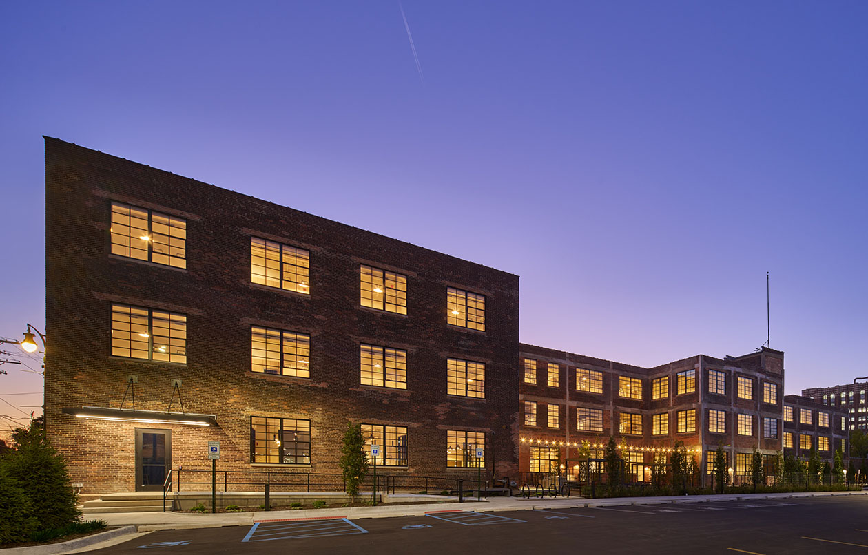 The scope of work for the historic factory renovation project involves a significant amount of demolition and reconstruction. 450 Amsterdam is located in a historic area with a rich industrial and commercial history, specifically in the New Amsterdam historic district and the New Center neighborhood in Detroit. This area was once a hub for automobile manufacturing and assembly, with large lot sizes and access to railroads making it an attractive location for businesses.