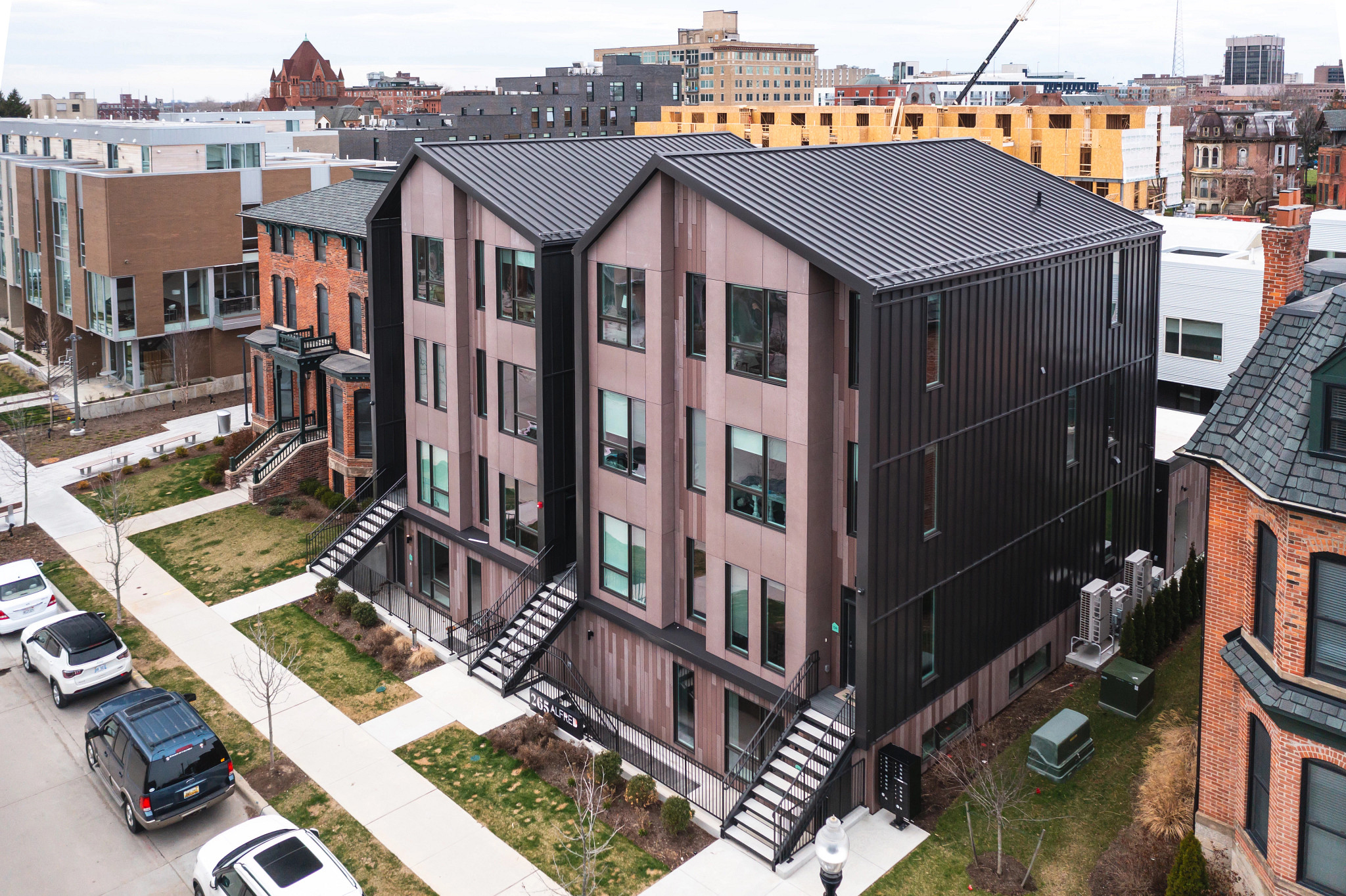 As a part of the historic Brush Park neighborhood, City Modern is situated in one of the largest residential locations adjacent to downtown Detroit. The area affords access to active social surroundings, from dining to shopping and sports to arts – all within blocks of home. This building was part of the larger development project in the city of Detroit, which created 400 homes across four blocks using a variety of housing typologies: townhomes, carriage houses, and mid-rise apartment buildings.