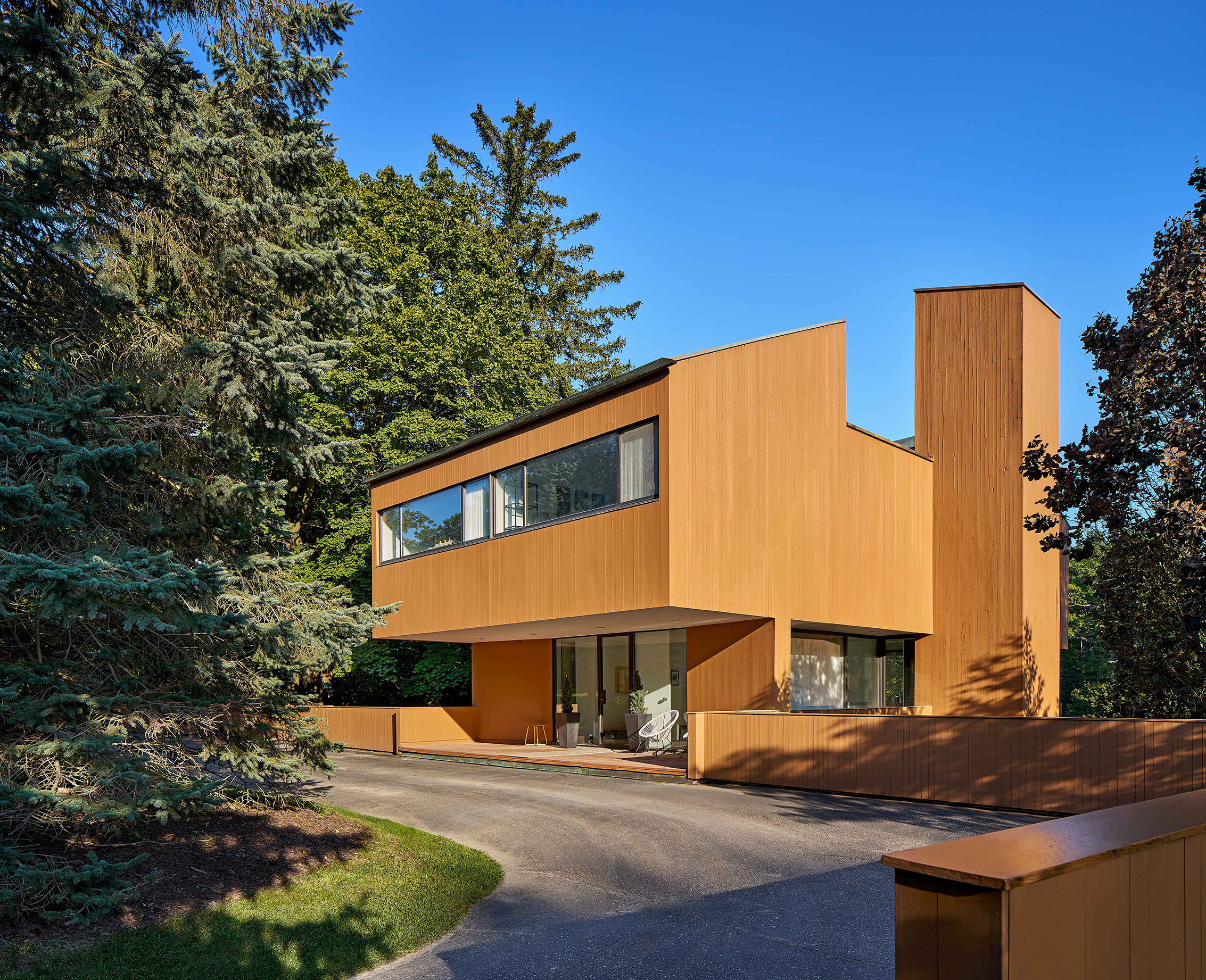 Originally designed in 1970 by a notable local architect as his own family home, this 3,800-square-foot midcentury modern residence perches dramatically on the edge of a ravine. Its geometric, vertically oriented form reads as two stories from the street but rises four stories at the rear, connected by twin towers—one with a spiral stair, the other with an elevator.