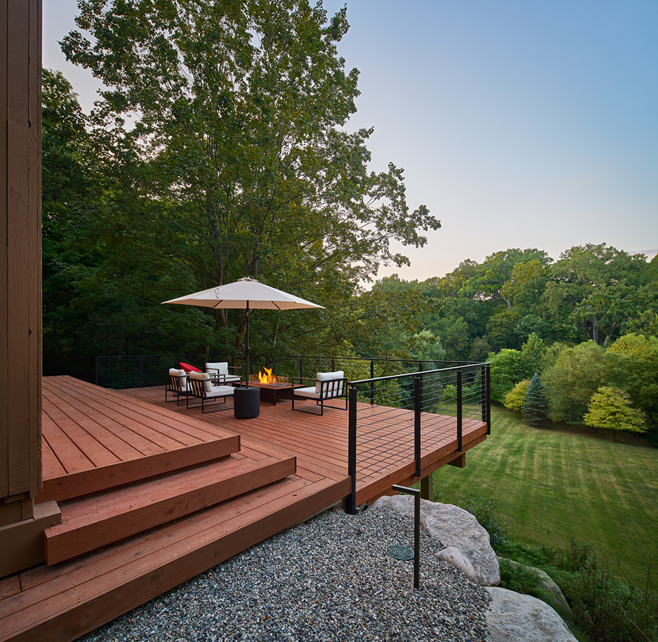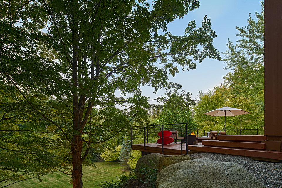 The new owners approached the project as stewards of this significant work, seeking to adapt it for contemporary living while preserving its architectural integrity. The design team restored the home’s exterior character with paint closely matching the original palette and reinstated a rear deck that now appears to float, extending the interior living space through expansive sliding glass doors. A new kitchen-side deck and reimagined landscaping strengthen the home’s connection to its steep, wooded site.