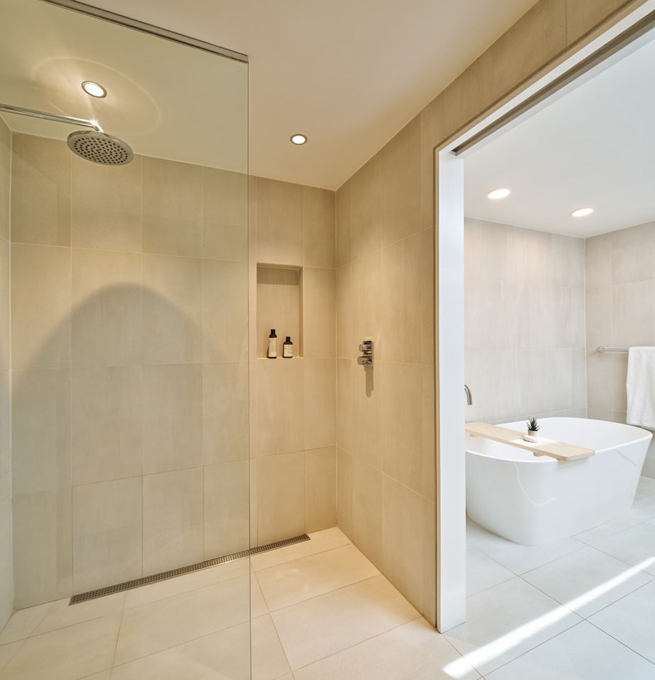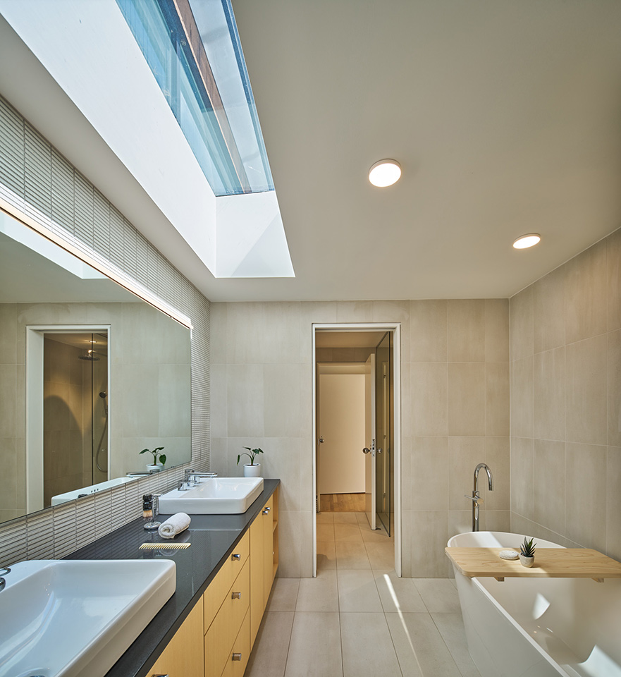 Inside, a dramatic two-story bookcase with a rolling ladder rises from the lowest level, while enhanced lighting highlights the sculptural spiral stair. The kitchen received subtle finish updates; new wood flooring replaced carpet on the upper level; and solar film was added to reduce heat gain. The expanded primary bath now features a fully tiled wet room with a curbless shower, freestanding tub, and a new vanity inspired by the original, naturally lit by a new skylight.